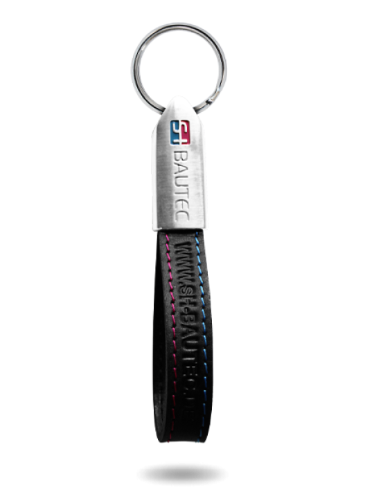 Dieser Schlüsselanhänger hat eine schmale Lederschlaufe und somit das Augenmerk auf der Metallmanschette.